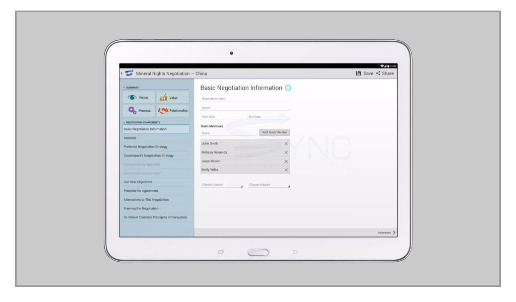 - SYNC Negotiation is a mobile app to aid in corporate negotiation process and to track tactics, strategies and interests of both parties involved in the negotiation.